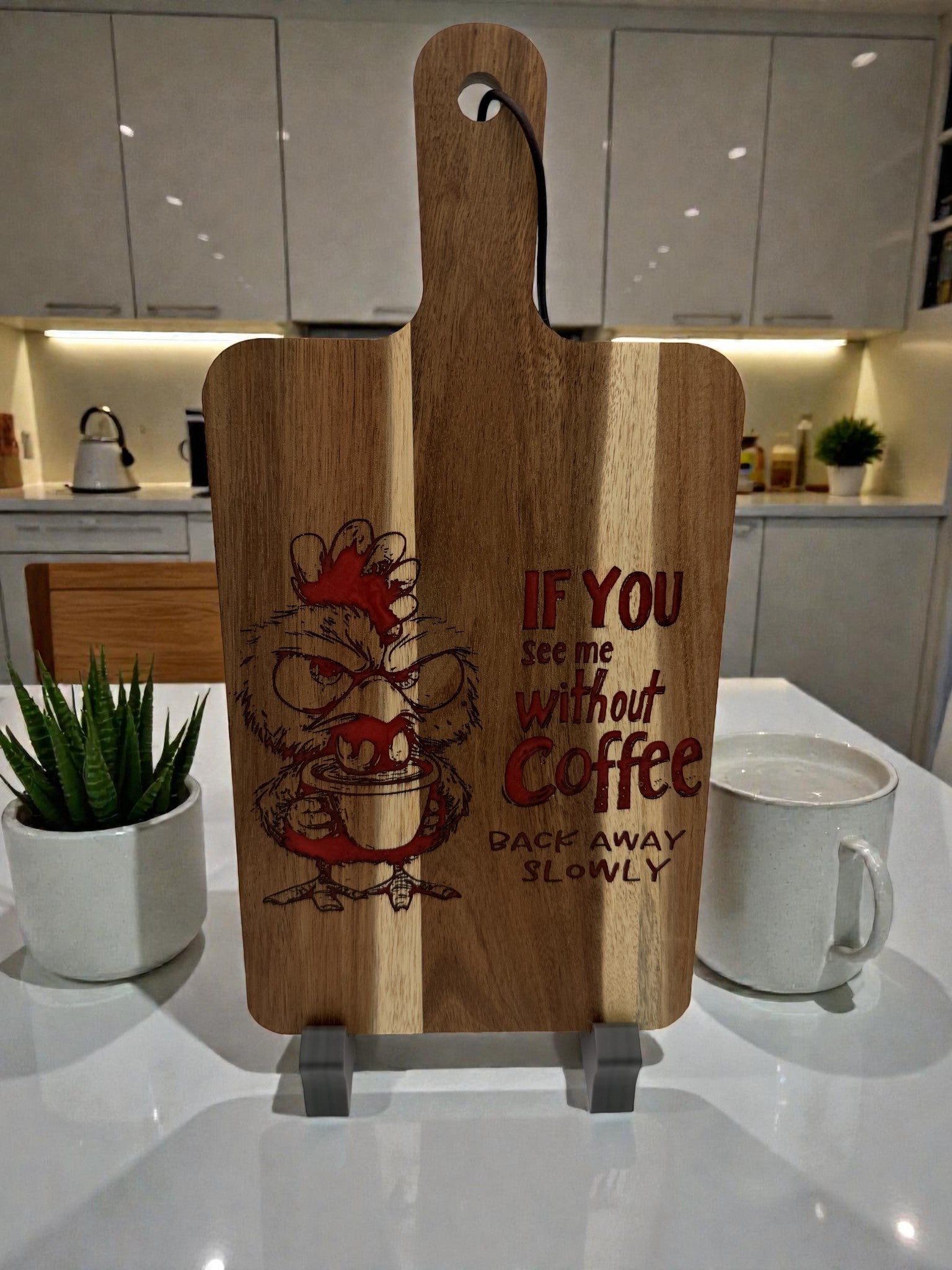 Acacia Wood cutting board with handle. Laser engraved then filled with food-safe resin for a unique look and color. Sanded to an ultra-smooth finish and treated with cutting board conditioner.